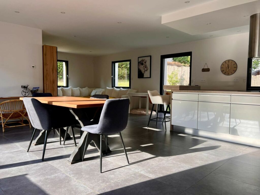 Cette maison de plain pied comprend une entrée donnant sur un grand séjour et une cuisine américaine.